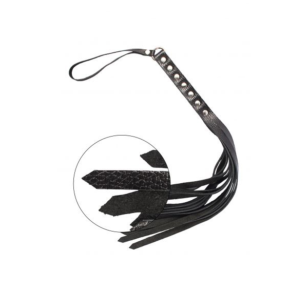 Флогер S&M Fancy Leather Floger, черный – это плеть с 12 хвостами, выполнена из натуральной телячьей кожи и декорирована металлическими заклепками. Данная модель флогера, относится к мягким видам прелюдии, поэтому ее могут использовать не только опытные пользователи, но и новички.